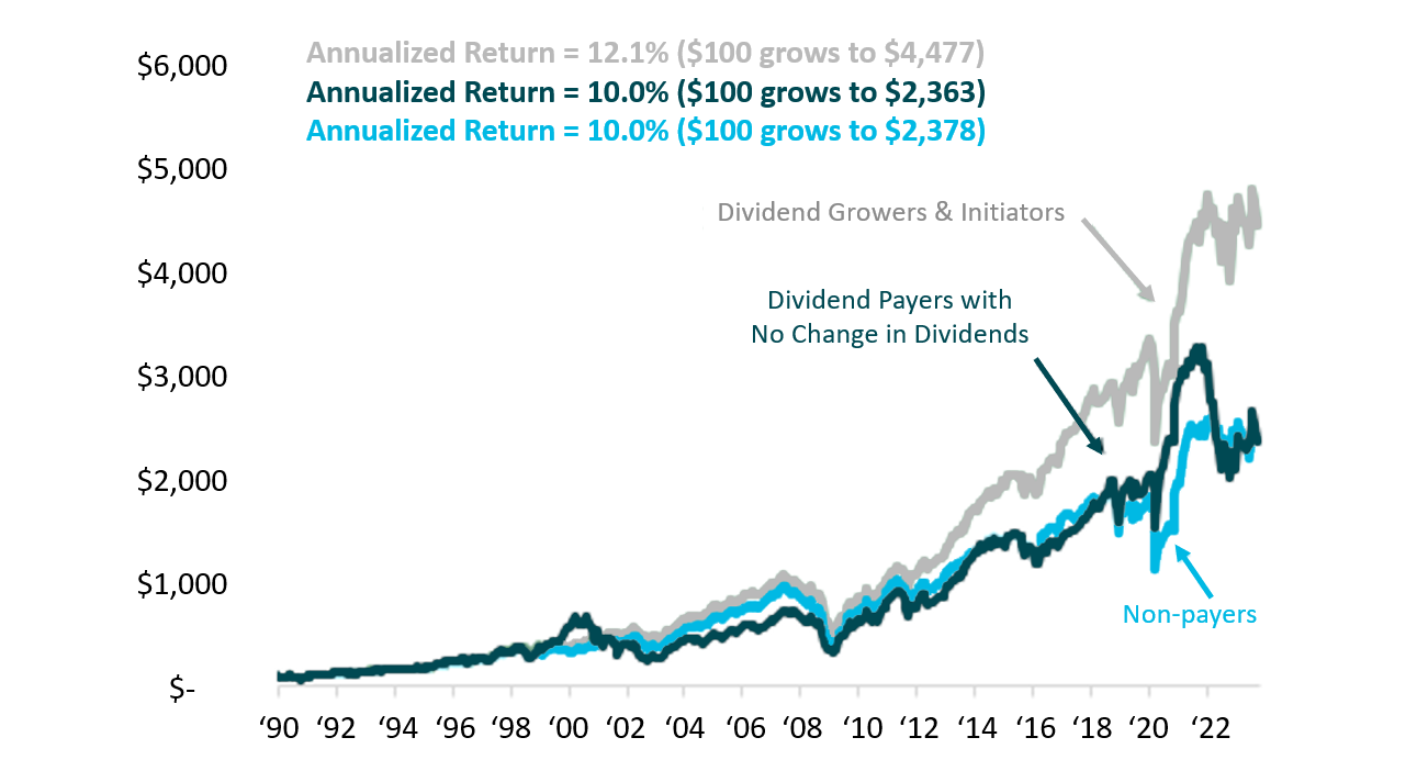 Figure 2: S&P 500 stocks, sorted by dividend policy, Jan 1990 – Sep 2023