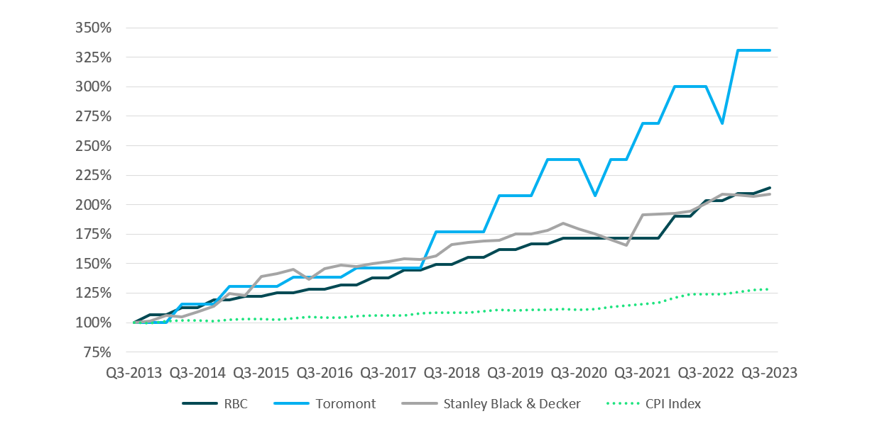 Figure 3: Dividend Growth of 3 Companies Versus Inflation, 10 Years Ended Sep 30, 2023