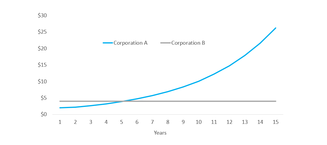 Figure 4: Hypothetical Dividend Payments from Zero-Growth and 20%-Growth Companies (Share price today: $100)