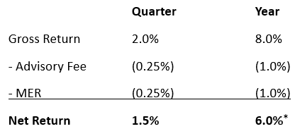 *Note on annual net return: I’ve shown the simple annual numbers in the table for ease of comprehension. Due to compounding, an account that generates 2.0% gross returns and pays 0.5% fees each quarter will generate a gross annual return of 8.24% and net annual return of 6.11%.
