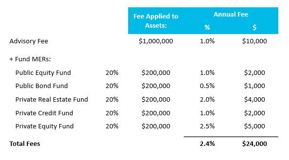 Read the fine print: MERs for funds that invest in strategies like private equity, real estate, or infrastructure can be significantly higher than public funds, so if your advisor has not built them into your advisory fee, be sure to understand what embedded MERs you are paying. Figure 3 shows what the actual fees could look like on a $1 million portfolio that charges an advisory fee and spreads the portfolio across a sample allocation of public and private asset funds. In this example, the headline “1%” advisory fee is just the tip of the iceberg, with total fees coming in closer to 2.4%, for an incremental 1.4%, or $14,000 in annual fees.