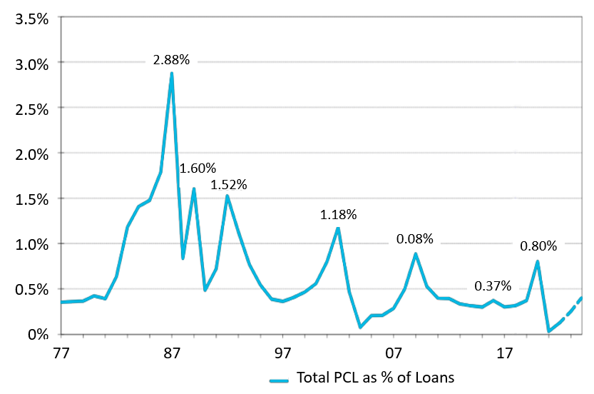 As you can see in Figure 1, in the last 20 years Canada’s six largest banks have generally estimated losses of less than 0.5% per year (with the extraordinary years of 2008 and 2020 still coming in under 0.9%). In other words, 99.5% of loans tend to get paid back through a full economic cycle.