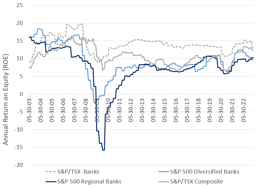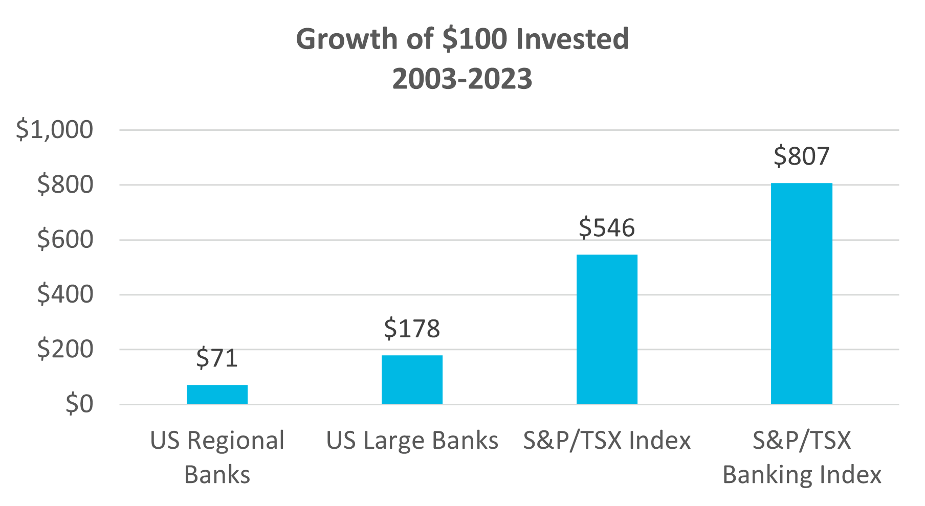 Figure 3: Growth of $100 Invested, April 30, 2003 – April 30, 2023 (Canadian dollars)Source: Factset. S&P 500 Regional Banks Index and S&P 500 Diversified Banks Index represent regional and large cap bars, respectively.