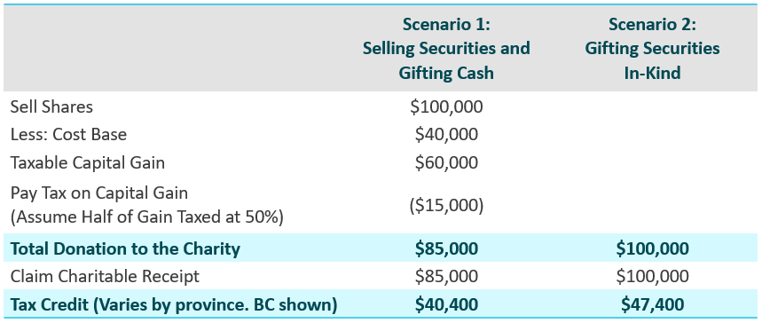 Figure 1 also demonstrates how donors can increase their net donation while maximizing the tax benefit from the gift, by transferring securities with embedded capital gains. (Note there are several changes to the taxation of capital gains currently being considered by the federal government, so please treat the simplified assumptions of 50% inclusion rate and 50% tax rate as just illustrations.)