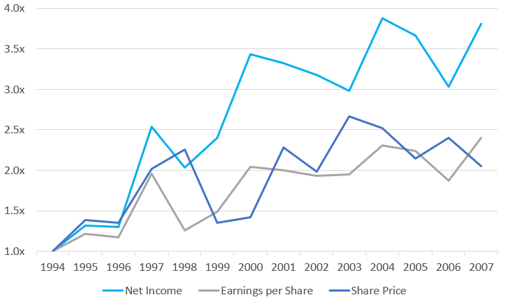 Figure 5: Magna International Net Income, Earnings per Share and Stock Price, 1994-2007 (Indexed to 1994)