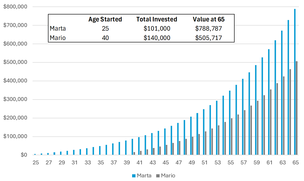 Consider the following example: Marta invests $5,000 in the market at age 25 and then adds $2,400 every year until she turns 65. Mario waits until he’s 40 to start investing. He puts $15,000 into an investment account and then tops it up with $5,000 per year until he hits 65. Assuming both earn 8% average returns per year, Marta will contribute 40% less over her lifetime but end up with over 55% more ($789,000 versus Mario’s $506,000).