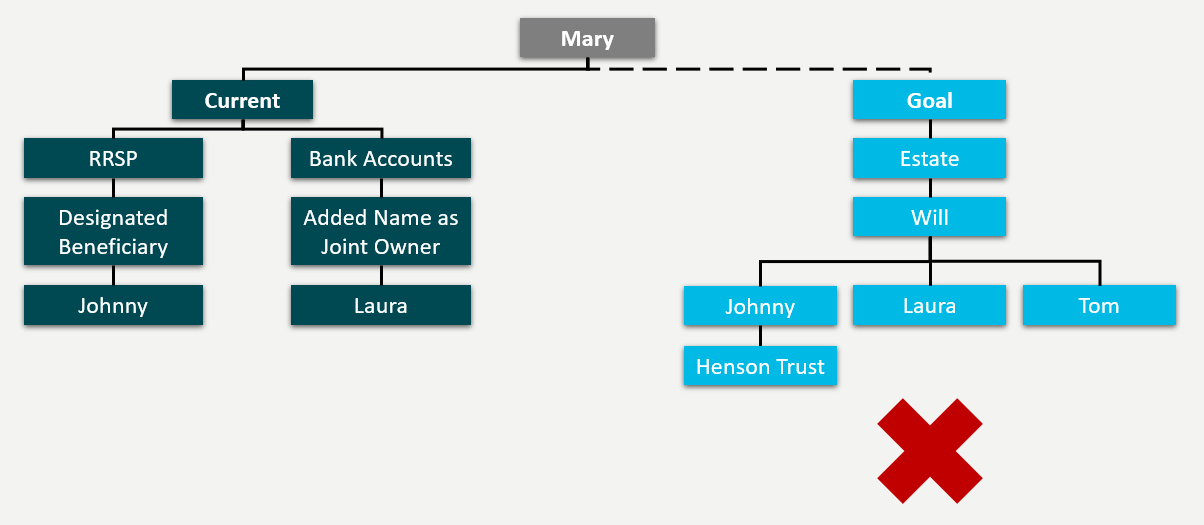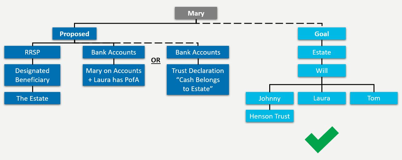 Jointly held bank accounts fall outside the estate and are not controlled by the executor. By undertaking a “flow analysis” in advance, Mary has the option to take Laura off the bank accounts and, as a better alternative, to grant her a Power of Attorney so Laura can assist her in managing her regular bill payments and investments. Keeping the account in Mary’s name would allow the funds to be controlled by the executor and distributed in accordance with her last Will.